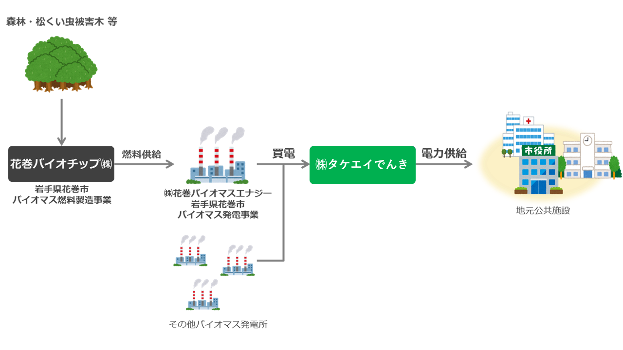 花巻バイオマスエナジーで作られる電気は、岩手県産の間伐材と、松くい虫被害木を燃料に作られています。